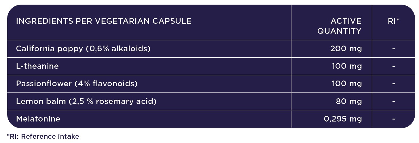 Lemon balm supports healthy sleep*, while skullcap and passionflower help reduce stress and promote relaxation. L-theanine encourages inner calm, and melatonin helps you fall asleep faster.